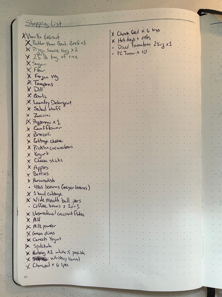 I probably don’t need to go too in depth on this. I just split the page into two columns and write down what I need when. Each item gets a dot in front of it, and just like the inventory, when I buy it, it gets x’d out. But don’t let that simplicity fool you. There are actually some real benefits to having a persistent list to look at and review.